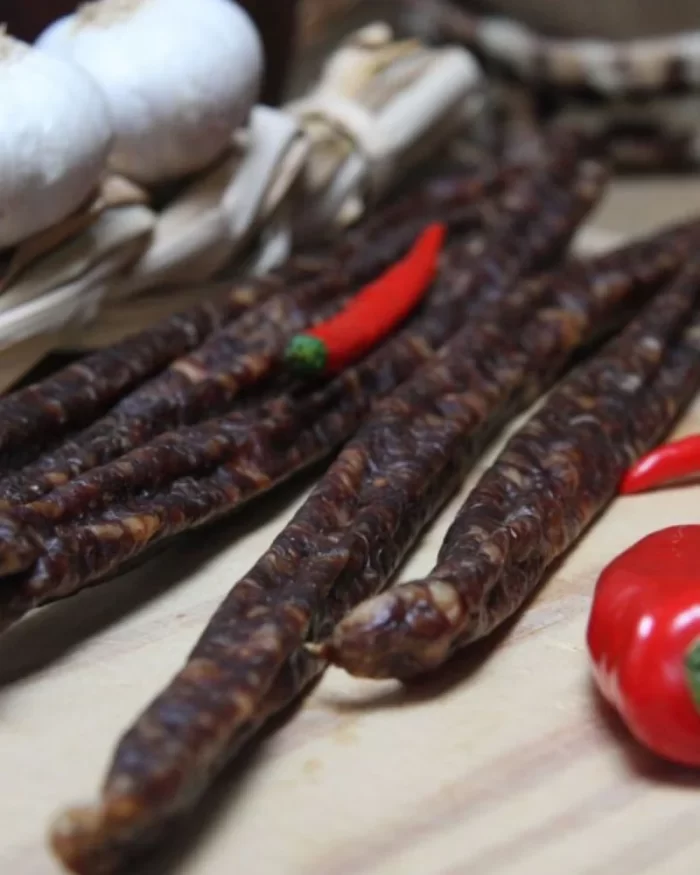 Droewors [Drywors] is a dried version of the popular South African sausage, boerewors, of which thinner boerewors sausages are dried to create droewors. The thinner boerewors sausage are usually chosen for drying as they dry more quickly and are far less likely to spoil during the drying process.